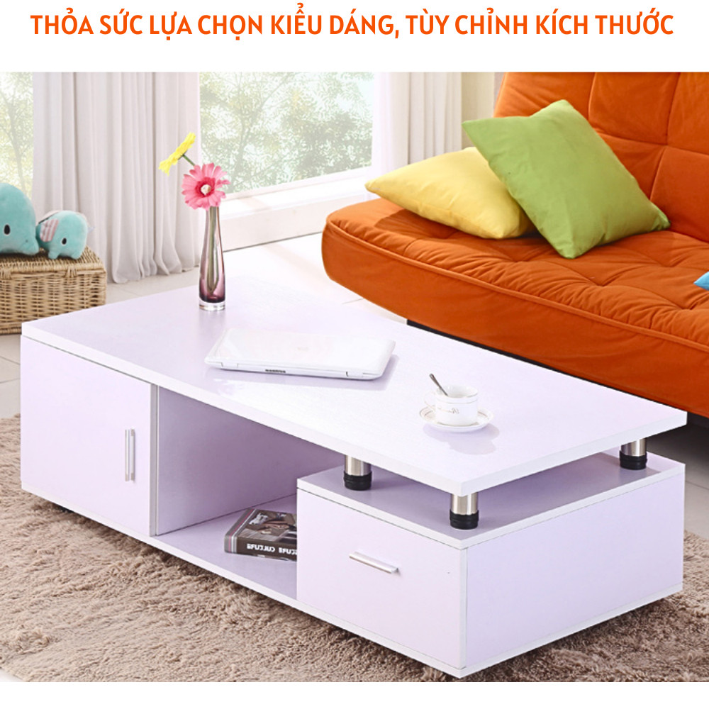 Bàn sofa, bàn trà gỗ công nghiệp MDF mặt bàn kính sang trọng – HH904 được làm bằng Gỗ công nghiệp MDF dày 17ly phủ bề mặt Melamine chống trầy xước, cạnh dán nẹp nhựa không thấm nước cho sản phẩm bền vững vô cùng. Sản phẩm gồm 2 ngăn kéo 2 bên và khoang chứa đồ cảnh mở 2 bên, chân inox đế cao su chống trượt chắc chắn kết hợp với mặt bàn là 1 lớp kính nâng cao vẻ ngoài sang trọng sẽ là một sự lựa chọn tinh tế giúp phòng khách nhà bạn trở lên đẹp mắt và độc đáo
