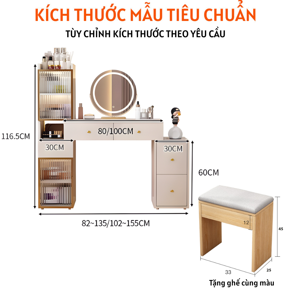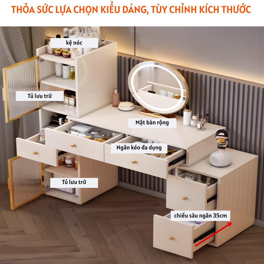 Tủ bàn trang điểm đẹp cánh kính sang trọng có thể tùy chỉnh kích thước – HH1302 giúp bạn không chỉ có một không gian làm đẹp chuyên nghiệp mà còn là một góc riêng tư và sang trọng để thư giãn và làm đẹp bản thân. Hãy để sản phẩm này trở thành điểm nhấn hoàn hảo cho không gian sống của bạn.